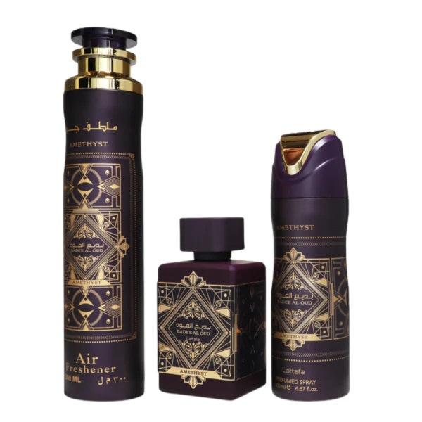 Lattafa Bade'e Al Oud Amethyst 100ml EDP Spray + 200ml Perfume Spray + 300ml Air Freshener Gift Set