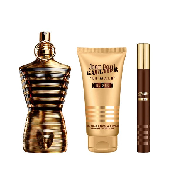 Jean Paul Gaultier Le Male Elixir 75ml Parfum Spray + 10ml Parfum Spray + 75ml All Over Shower Gel Gift Set 2025